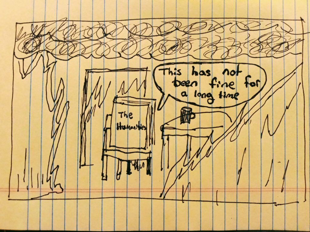 No matter how I looked at it—whether the world was falling apart, had already fallen apart, or had never really been functioning properly—I found myself in a bind. How could I keep teaching without becoming the embodiment of the “This is fine” meme, which features a dog drinking coffee in a burning building? What did it mean to encourage my students to read, write, and think within this newly afresh context of chaos? Now, in a way that I had never been quite as cognizant of before, my “cool” stories, movies, television shows, and New Yorker articles smacked of the frivolity usually reserved for readers of romantic novels. And my grammar lessons felt, at the best, somewhat unimportant and, at the worst, extensions of the language-controlling power structures that my students and myself were becoming increasingly skeptical of.