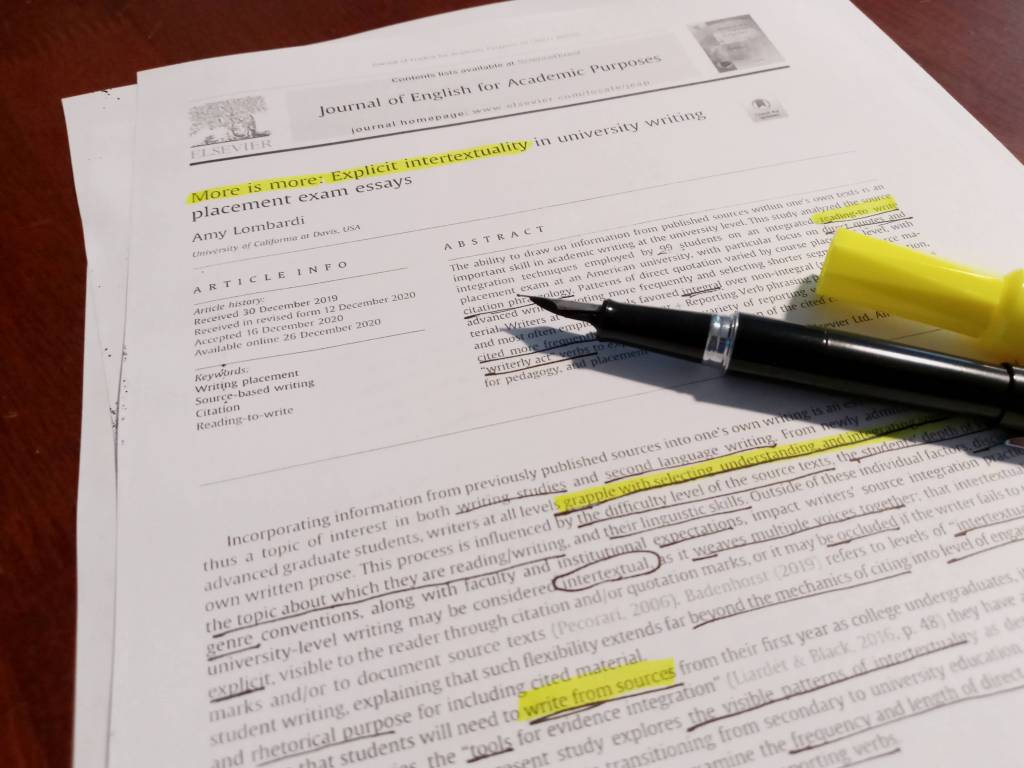 “We need to learn to listen and read and interpret messages more thoughtfully,” Amy Lombardi told me. A doctoral student at the University of California at Davis, Lombardi says such skills are “undervalued and need to be taught more.” In our conversation recorded below, we talk about Lombardi’s recent article “More Is More: Explicit Intertextuality in University Writing Placement Exam Essays.” This study is an admittedly hyper-specific examination—looking at a corpus of exam essays written by incoming college students to see how they cite sources, including the phrasing (how many times do they say “says” vs. “believes” vs. “opposed”?) and punctuation (does all the mention of the sources get crammed into parentheses or are the sources actually named and discussed in the writing?). But in this very specific focus, this is still a study with bearing on a much broader topic: “receptive skills.” The phrases and punctuation that students use (or do not use) to cite sources are “the techniques they’re using to signal to the reader overtly that they’re bringing in information from other sources.” Looking at how students cite is thus a perfect site for examining larger skills such as “reading as a listener” and “listening to the text.” Isn’t writing often referred to as a conversation? Well, Lombardi notes, “these [details of citation] to me are the elements of that conversation.”